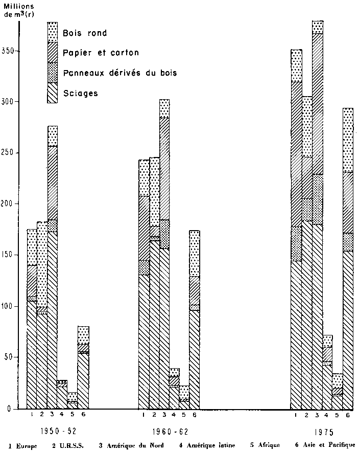 On trouvera au tableau II-1 un résumé des agrégats globaux. En 1951¹, la production et la consommation mondiales enregistrées s'élevaient à environ 810 millions de m³ de bois d'uvre et d'industrie et environ 870 millions de m³ de bois de feu. En 1961, ces volumes avaient atteint respectivement 1020 et 880 millions de m³. On voit donc qu'à l'échelle mondiale, la presque totalité de l'augmentation est imputable à l'industrie, dont la consommation s'est accrue d'environ 25 pour cent pendant les dix ans considérés. En ce qui concerne les bois d'uvre et d'industrie) on verra d'après le tableau que l'évolution, pendant la période envisagée, a été très différente suivant la nature des différents produits. La consommation mondiale de bois rond (bois de mine, poteaux et pieux, etc.) n'a pas augmenté, alors que la consommation de sciages a progressé d'environ 30 pour cent et la production de papier et carton d'environ 75 pour cent. Pour les panneau dérivés du bois, l'essor a été encore plus rapide: au ours de la décennie, la consommation de panneaux de fibre a plus que doublé, cependant que la consommation de contre-plaqué augmentait de près de 150 pou cent et qu'un produit pratiquement nouveau, le pan eau de particules, apparaissait sur le marché; dès 19 1, son usage était très répandu et se généralisait rapidement.