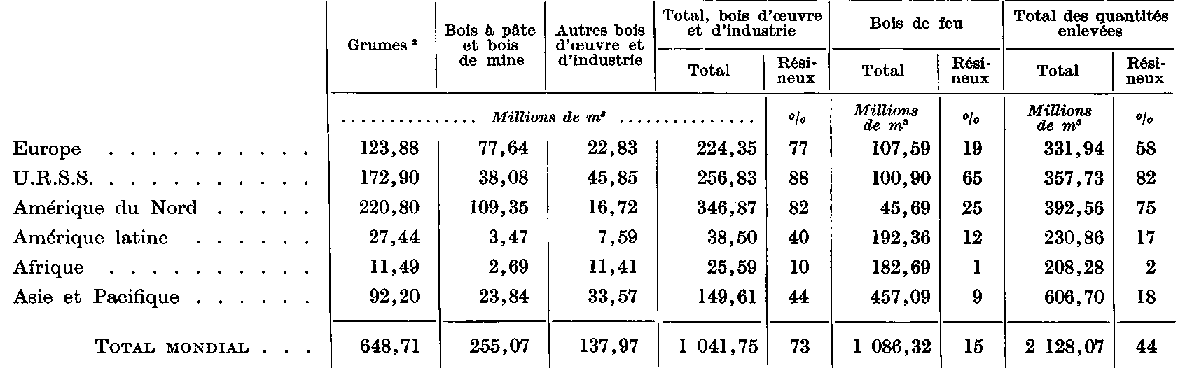 Il est bon, tout d'abord, de rapporter la distribution, la grandeur et les caractéristiques des forêts au tableau de la consommation établi dans le chapitre précédent. En Europe, en U.R.S.S., en Amérique du:Nord et au Japon, qui sont les régions où l'on consomme le plus de bois, c'est la forêt de résineux qui domine. Le nord de toutes ces régions est occupé par une large bande densément boisée en conifères. Au Canada, dans le nord de l'Europe, dans les provinces sibériennes de l'U.R.S.S., et dans le nord du Japon, la forêt de résineux couvre la plus grande partie du territoire. L'existence de cette grande réserve de résineux à proximité de régions Censément peuplées et économiquement avancées situées immédiatement au sud a été naturellement un facteur déterminant en ce qui concerne le mode d'utilisation du bois et la structure de l'industrie du bois.