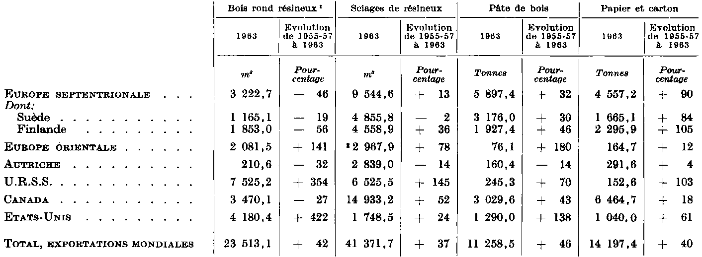 Du côté des grandes régions exportatrices, ce n'est qu'en Europe septentrionale que la restriction des disponibilités de bois brut commence à freiner l'expansion des exportations (en volume). Il faut toutefois noter que, parallèlement à une évolution en faveur des produits qui doivent subir une plus grande transformation, le total des exportations nettes de produits du bois de la région est encore en forte augmentation. Mais il est maintenant évident que l'Europe septentrionale n'est plus en mesure d'augmenter ses excédents exportables de bois, en volume, et que l'Europe dans son ensemble est devenue importatrice nette. Ses importations nettes déjà notables, ne cessent de croître, ce qui présente manifestement une importance primordiale pour l'économie forestière et les industries du bois du reste du monde.