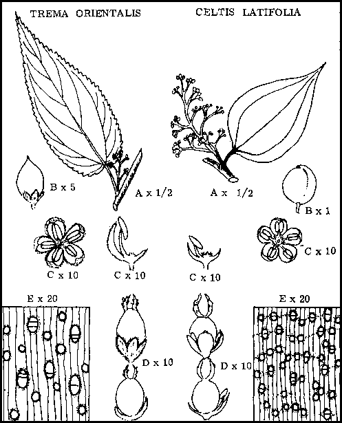 Note that, in the following more detailed descriptions of Celtis latifolia and Trema orientalis broken underlining refers to family features, continuous underlining to important specific features.