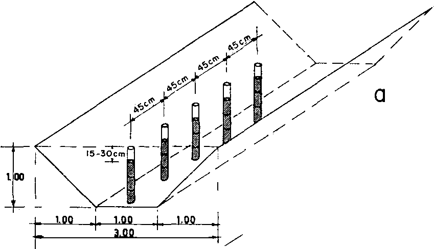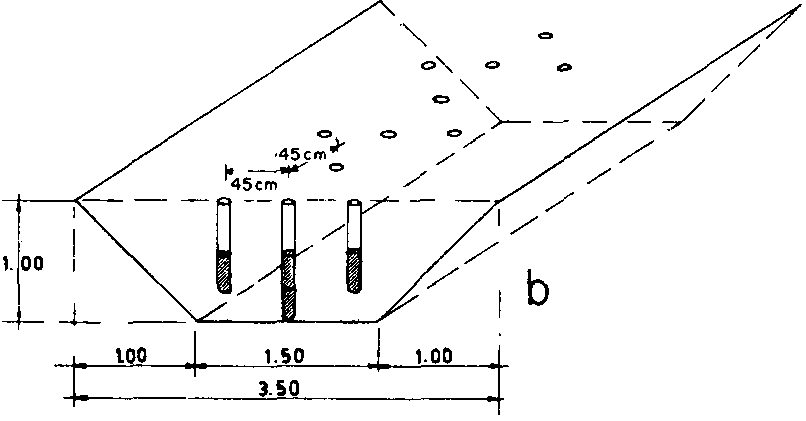 Post-hole method. An effective way to blast deep ditches, especially in heavier, compact types of soil, post-holing consists in placing charges of several pounds in auger-drilled holes, at two thirds the depth of the required ditch and spaced 0.9 to 1.2 meters apart, depending on the charge. The loads are fired by propagation or by individual ignition (detonating fuse, electric caps). Because of its fewer but heavier charges per unit length as compared with the other two methods, post-holing is a suitable ditch blasting method in dry conditions, where all individual charges must be ignited (Figure 5c).