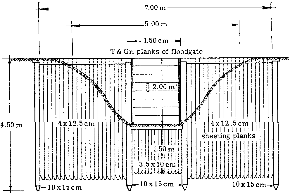 FIGURES 8 and 9. - Construction drawing and photograph of permanent weir and floodgate in the main exit of the Perica ditch system. The gate consists of 3 x 10-inch (7.6 x 25 cm) tongued & grooved planks which move between 2 U-beams. Water flow is regulated by removing or placing planks as required.