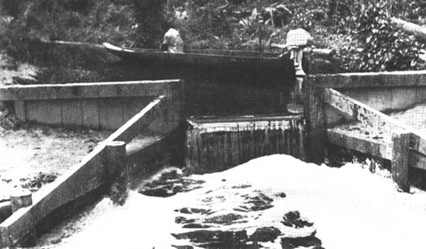 Even in the opened up swamp forests logging is confined to the rain: seasons, when the loggers are able to construct shallow trenches through the inundated swamp with little effort, to float out the felled logs to the extraction ditches. To prevent the water from draining away too rapidly and to extend the timber exploitation into the dry season, permanent weirs with removable wooden gates are built in the exit channels. During the rainy seasons the gates are partly opened to create a steady current in the ditches, that aids in the floating out of the logs and cleans the channel by its scouring action. When the rains abate and the water level starts to drop, the gates are closed.