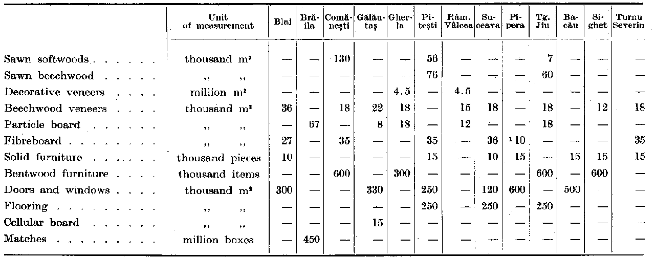 Many of the products listed in Table 6 have been manufactured for the first time in Romania. Examples are external (water-resistant) plywoods for coffering, naval constructions, etc., three-layer particle board made of beech and softwood species, structured particle board, beech hardboard, insulation and bituminous board, cellular board with a spiral veneer core, densified laminated wood, fibreboard made of plasticized and enameled wood, Lamelin type veneers, finished doors and windows, matches packed in cardboard boxes, etc.