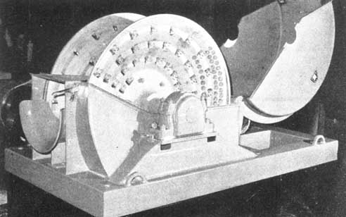 Spiral chipper model 700-A. Horizontally-fed spiral chipper for up to 18 in (46 cm) roundwood or sawmill waste. Knives cut parallel to fibers of wood so that both length and thickness of chips can be predetermined. Chipper consists of two disks in the shape of truncated cones and forming a V-slot into which wood is fed. Rows of knives are mounted in spiral on both conical discs. Feed rate is 131 ft/min (40 m/min). Stationary or mobile models available.