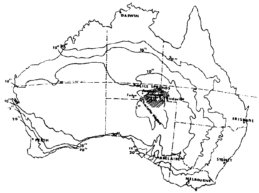 The climatic conditions under which it occurs are indicated by the station Charlotte Waters in the Northern Territory (Figure 2), somewhat to the west of the area of natural occurrence. It will be seen that the rainfall is very low on an annual basis; it is also very erratic. The tree is not subjected to more than occasional very light frosts but exceedingly low humidity through much of the year is a feature of the habitat.