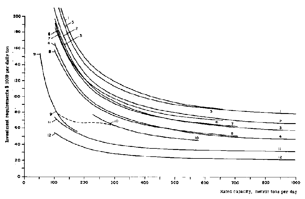 Figures 1 and 2 show that for most of the products considered the investment requirements per unit of capacity decrease rather rapidly. A groundwood mill is, however, an instance where the investment requirements per unit of capacity do not depend particularly on the mill size.