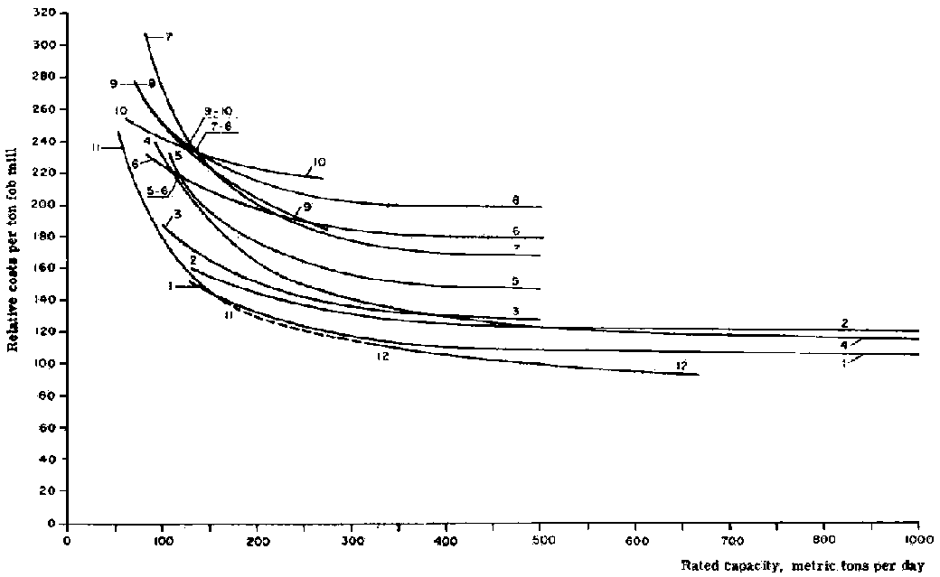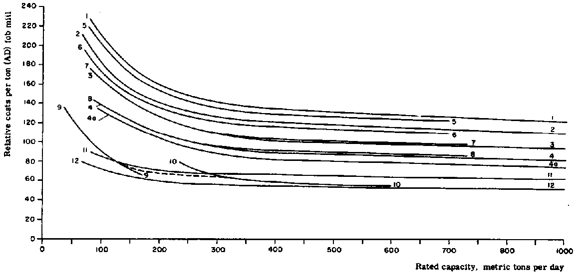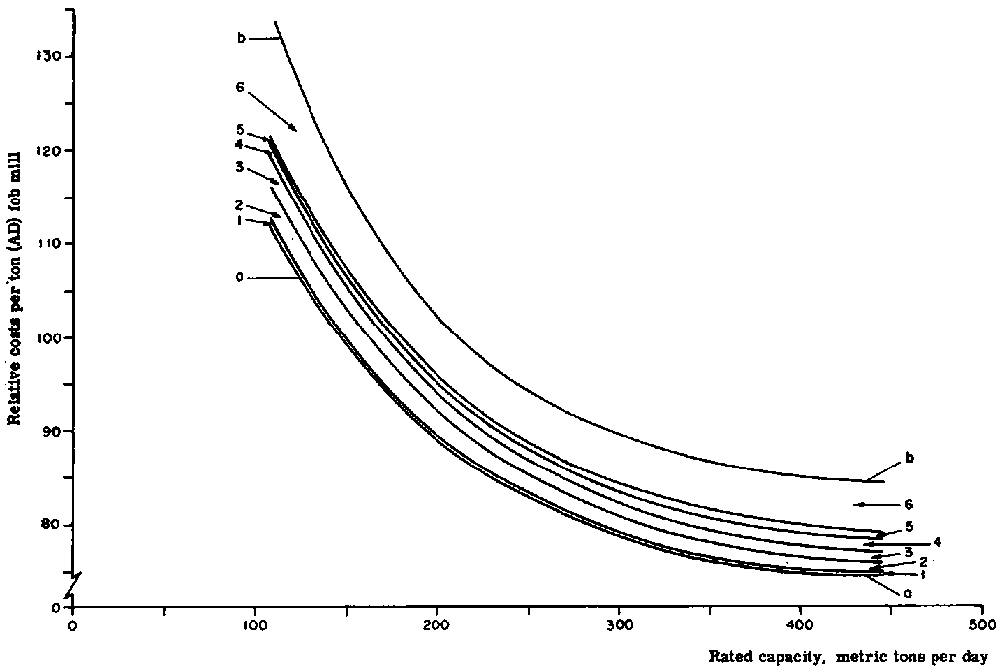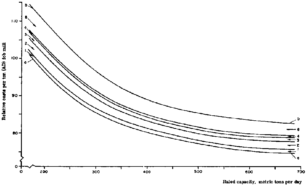 Relative manufacturing costs are shown in Figures 3 and 4, which illustrate the influence of the mill size and interrelationships between the various products even if the cost ratios are not quite constant owing to local differences. It can be concluded that the manufacturing costs of most of the bulk type pulp and paper products very much depend on mill size. Consequently, within large free markets such as the United States, and in the exporting countries, mill sizes tend to grow and competition brings prices down to a level where only large mills are reasonably profitable.