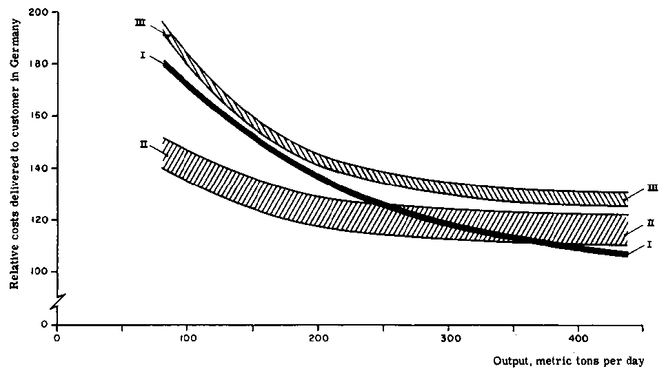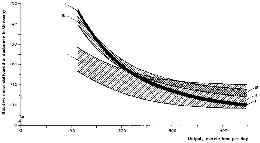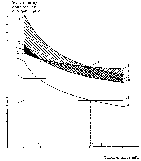 In Figure 7 there is also a curve representing the manufacturing costs of an integrated pulp/paper mill, and another representing the aggregate production costs of separate, captive pulp and paper mills. The shaded area between the two curves thus represents the above-mentioned integration saving.