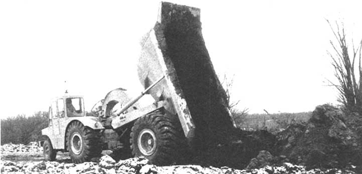 Athey - 15-ton rear dump hauling unit. - Articulated design permits 90° turns between rocker and tractor. Hauler turns in less than its own length, raising body reduces wheelbase for shorter turn radius. Capacity 9 cu yd (6.9 m3). Body tilted for dumping by single hydraulic control lever - dump angle of 50º - overall dimension length rear dump 18 ft 7 in (566 cm), width 10 ft (3 m), height 9 ft 5 in (288 cm), ground clearance 18 ½ in (46 cm).