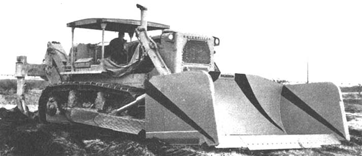 Balderson bowldozers. - Developed primarily for high-volume dozing applications. Rear wall of the bowldozer is similar to a conventional straight dozer. Side walls extend 5 to 7 ft (153 to 214 cm) straight ahead and are connected at lower front corners with shallow beam equipped with scraper-type cutting edge. Depth of cut of leading edge controlled by two tilt cylinders providing tip. For Caterpillar D6, D7, D8 and D9 tractors.