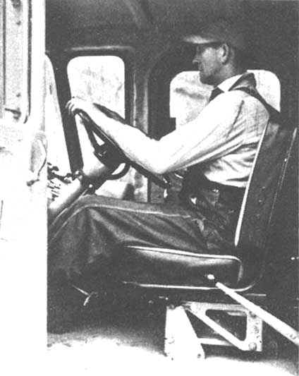 Caterpillar air-suspended seat. - Seat has broad, flat base and back to allow operator to shift position frequently. Air pressure system keeps seat at predetermined level regardless of operator's weight. In operation, air is admitted to and expelled from a chamber to absorb bouncing. 7 in (18 cm) of horizontal travel permit operator to shift seat.
