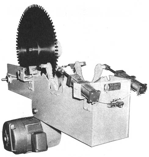 Ward cut-off saw. - Cut-off saw for high-speed operation. Integral unit combining the log jaws and saw arm in one frame. Three models - cut up to 48 in (122 cm) log. Rim speed on all sizes is approximately 14,000 fpm (4,266 mpm).