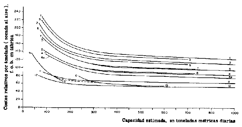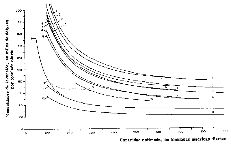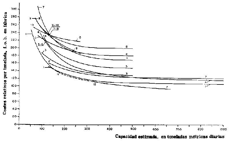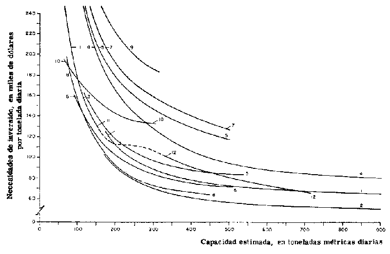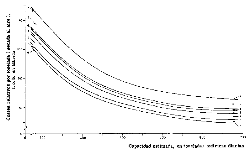 En las figuras 1 y 2 pueden verse las necesidades aproximadas de inversión en función del tamaño de la fábrica. Las necesidades totales de inversión aumentan, por supuesto, al aumentar el tamaño de la fábrica, pero las necesidades de inversión por unidad de capacidad disminuyen al aumentar la capacidad. Este fenómeno es pronunciado en los casos en que es posible aumentar la capacidad, sin que sea preciso incrementar el número de cadenas de producción, es decir, en los casos en que se dispone de unidades de equipo de gran capacidad. Como ejemplo de equipo disponible de grandes unidades a precios menores por unidad de capacidad cabe citar: calderas y turbinas, unidades de recuperación, digestores continuos y determinadas máquinas para la elaboración de papel y cartón.