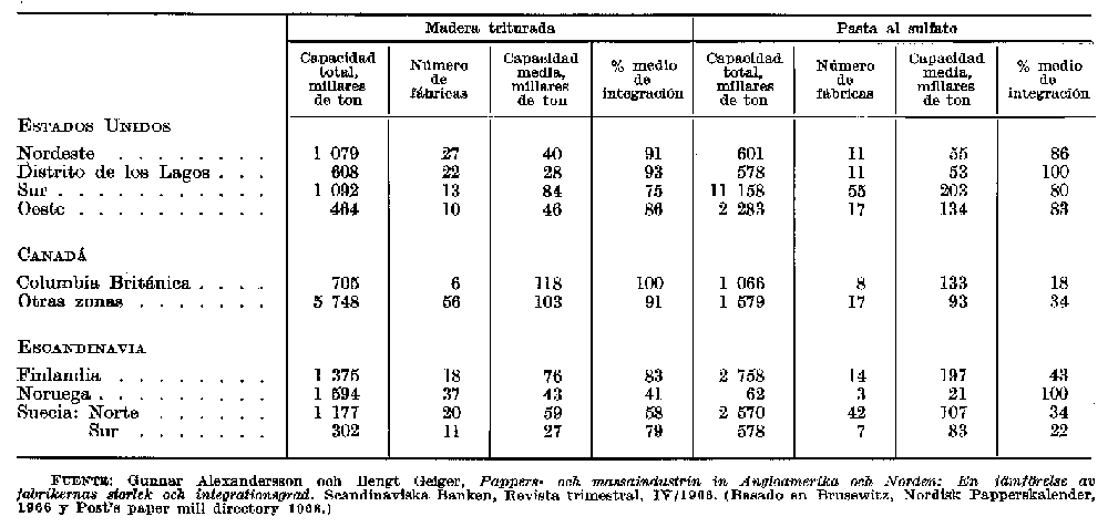 En América del Norte, alrededor del 80 al 90 por ciento de la producción de pasta de papel está técnicamente integrada con la producción de papel, y se calcula que el 80 por ciento, más o menos, de la producción de pasta comercial está financieramente integrada con la producción de papel.8 El comercio de la pasta consiste fundamentalmente en el intercambio de calidades entre compañías integradas. Los programas previstos de expansión ponen de manifiesto que se está produciendo un fuerte incremento de la producción de pasta al sulfato blanqueada con destino a los mercados de América del Norte, Europa occidental y Japón. Casi toda esta producción está integrada financieramente con las principales componías de pasta y papel de América del Norte y Europa. La producción norteamericana técnicamente integrada para el mercado europeo consistirá en forros kraft y también en papel para periódicos y para bolsas. Como en Escandinavia y en la República Federal de Alemania se han proyectado o instalado ya 12 nuevas máquinas de elaboración de papel para periódicos con una capacidad total aproximada de 1,2 millones de toneladas, que comenzarán a funcionar en la segunda mitad del decenio 1960-69 (y es posible que la capacidad de obtención de papel para periódicos aumente también en Franela y en España), resulta evidente que la capacidad de producción de este tipo de papel en Europa occidental está aumentando más deprisa que el consumo, lo cual dejará un margen para la exportación, incluso en el caso de que parte de la capacidad nueva y también de la existente se utilice para fabricar papeles para impresión mecánica.