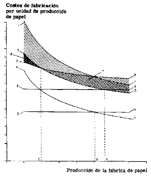 En la citada Figura 7 hay también una curva que representa los costes de fabricación de una fábrica integrada de pasta y papel y otra, que representa la suma de los costes de producción de una fábrica de papel y de otra de pasta propias. La zona rayada entre estas dos curvas representa, por tanto, el citado ahorro logrado merced a la integración.