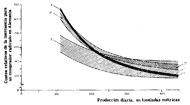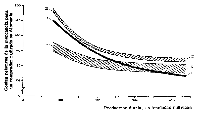 La Figura 9 muestra la gráfica correspondiente al cartón para envases de productos alimenticios, que representa un grupo de cartones blanqueados de valor superior. Como el precio del cartón para envases de productos alimenticios es mayor que el del papel sin blanquear para bolsas, también resulta superior el valor absoluto de los derechos e impuestos sobre tal cartón. Las economías derivadas de la integración en el caso del cartón y los papeles blanqueados son bastante menores, sin embargo, que en el de los cartones sin blanquear. Por consiguiente, la producción técnicamente no integrada en la República Federal de Alemania parece más rentable que la producción integrada en Escandinavia. Como las economías derivadas de la integración disminuyen en términos absolutos al aumentar el tamaño de la fábrica, al paso que los derechos aduaneros y los impuestos permanecen invariables, la producción no integrada en las fábricas grandes resulta rentable si el tamaño del mercado es suficiente. La Figura 9 parece indicar que en la producción de papeles de gran valor es más provechoso situar los medios de producción dentro de la barrera aduanera de la CEE que en Escandinavia si las fábricas que se quieren comparar tienen el mismo tamaño y la misma productividad de la mano de obra.