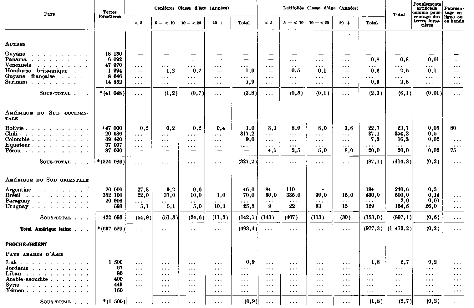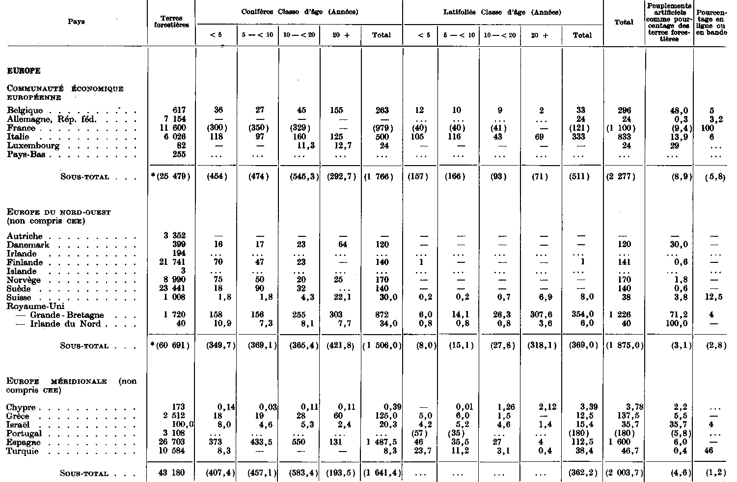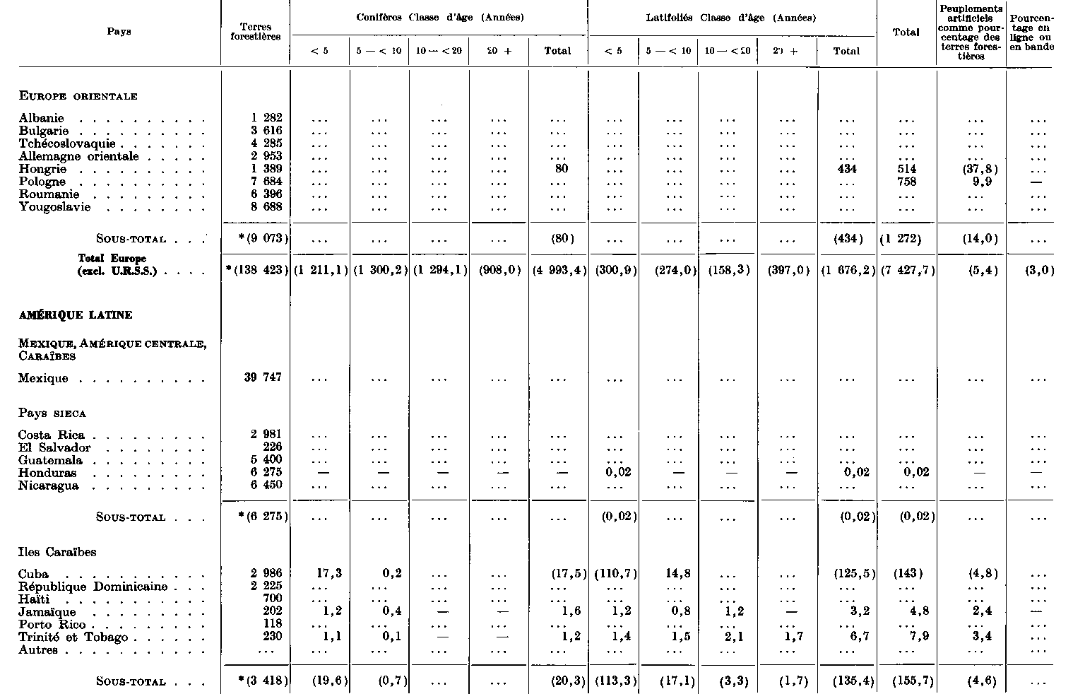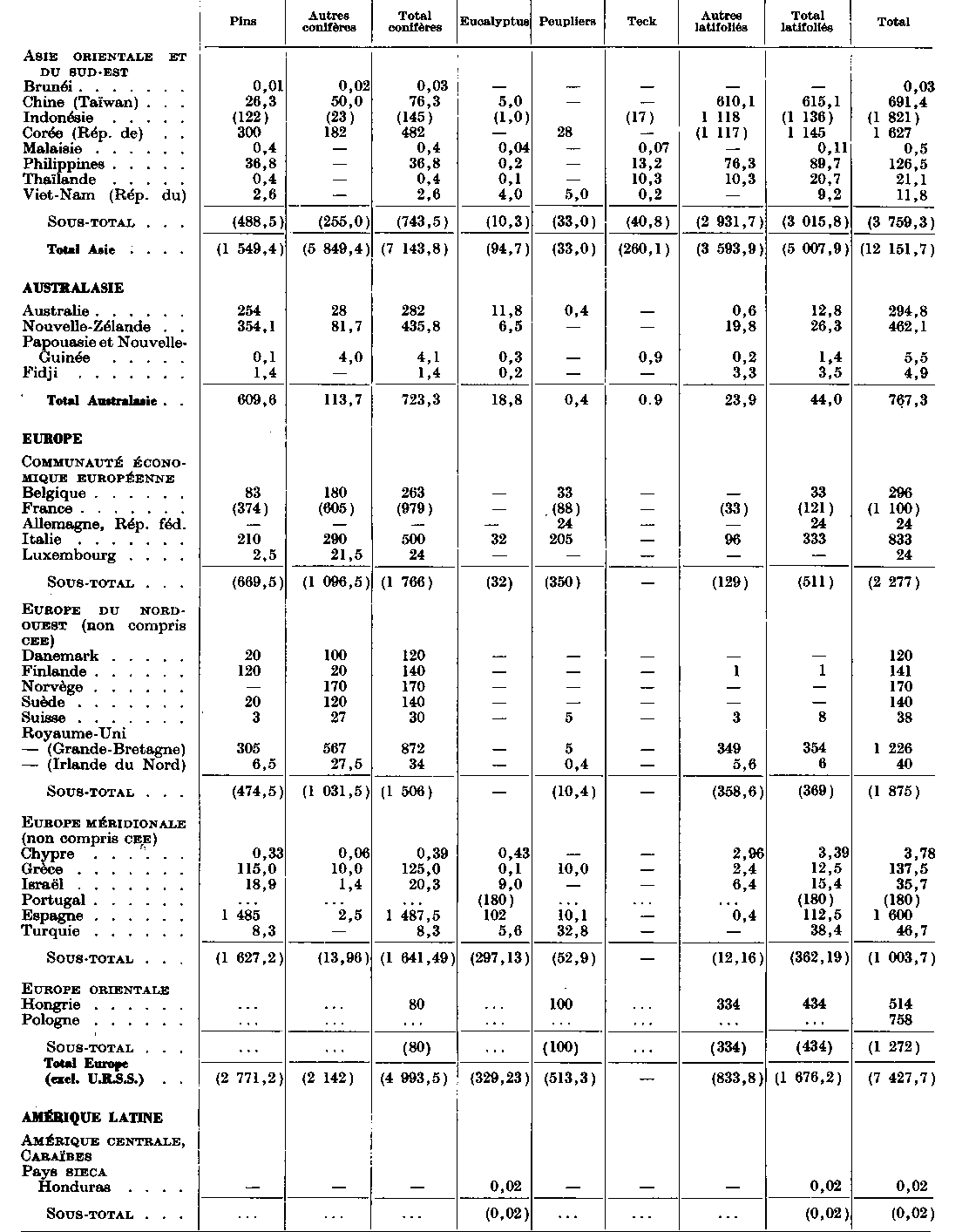 ABREVIATIONS ET SIGNES: Ha Hectare; - Néant ou insignifiant; ... Non disponible; () Chiffre connu pour être incomplet; En particulier totaux et sous-totaux couvrant les régions dont les pays n'ont pas fourni de données. * Total partiel réduit ou superficie totale réduite de la terre forestière, égal au terrain forestier total de ceux des pays ayant fourni des rapports sur les forêts artificielles. - ¹ Chiffre non officiel. - ² Chiffre anormalement élevé, du à une grande proportion d'arbres de bordureou d'alignement à l'exterieur des forêts. - ³ Pas de prévisions disponibles. Un chiffre minimal, égal à la surface des peuplements forestiers artificiels 10 (ou 20) ans auparavant, a été inséré. SIECA: Secretaría permanente del Tratado general de integración económica centroamericana (Traité général d'intégration économique de l'Amérique centrale).Pays dont les données sont négligeables ou inexistantes:Féd. de l'Arabie du Sud, Koweit, Malte. - Les chiffres de la colonne «Terres forestières» sont extraits de l'Inventaire forestier mondial 1963
