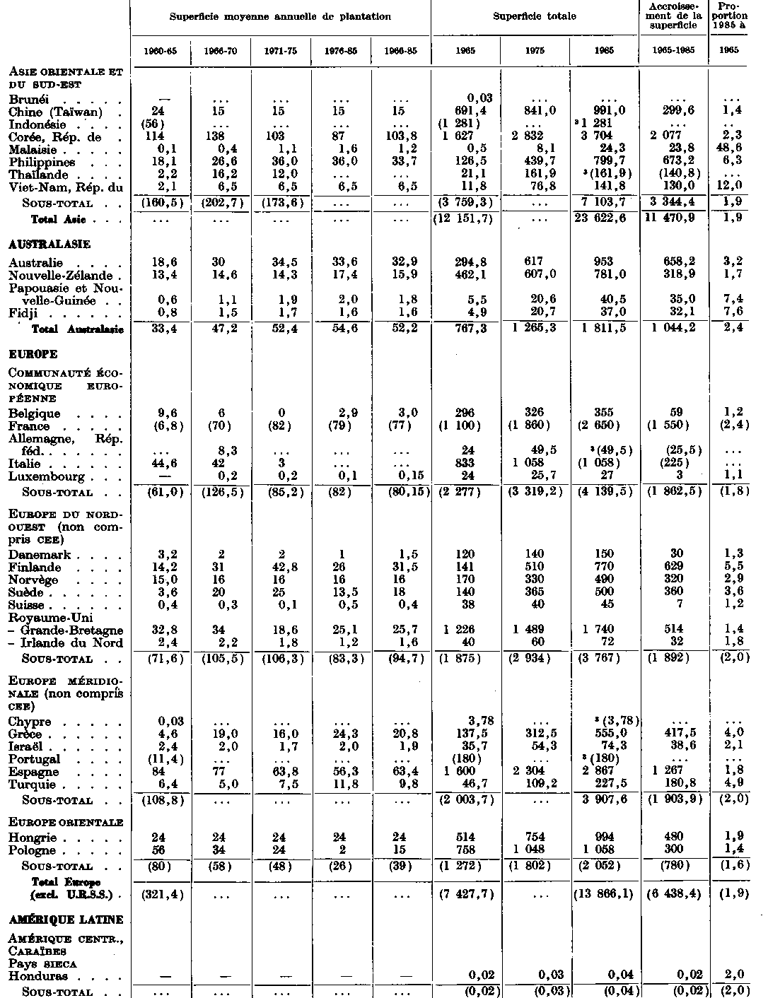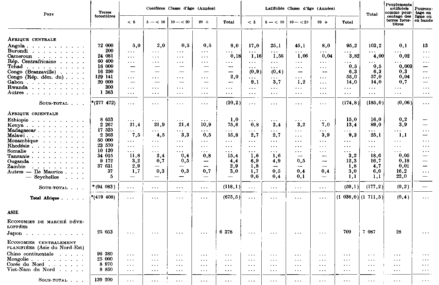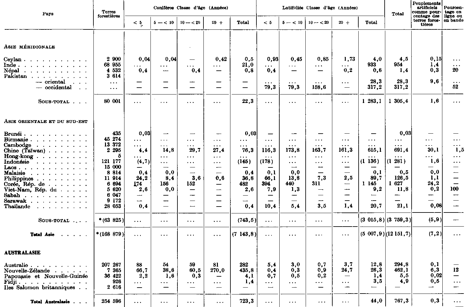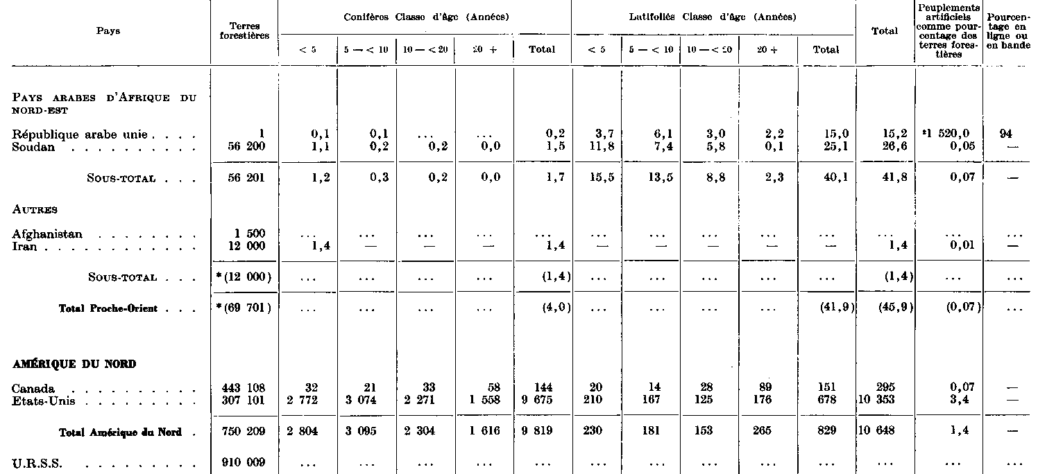 ABREVIATIONS ET SIGNES: Ha Hectare; - Néant ou insignifiant; ... Non disponible; () Chiffre connu pour être incomplet; En particulier totaux et sous-totaux couvrant les régions dont les pays n'ont pas fourni de données. * Total partiel réduit ou superficie totale réduite de la terre forestière, égal au terrain forestier total de ceux des pays ayant fourni des rapports sur les forêts artificielles. - ¹ Chiffre non officiel. - ² Chiffre anormalement élevé, du à une grande proportion d'arbres de bordureou d'alignement à l'exterieur des forêts. - ³ Pas de prévisions disponibles. Un chiffre minimal, égal à la surface des peuplements forestiers artificiels 10 (ou 20) ans auparavant, a été inséré. SIECA: Secretaría permanente del Tratado general de integración económica centroamericana (Traité général d'intégration économique de l'Amérique centrale).Pays dont les données sont négligeables ou inexistantes:Féd. de l'Arabie du Sud, Koweit, Malte. - Les chiffres de la colonne «Terres forestières» sont extraits de l'Inventaire forestier mondial 1963