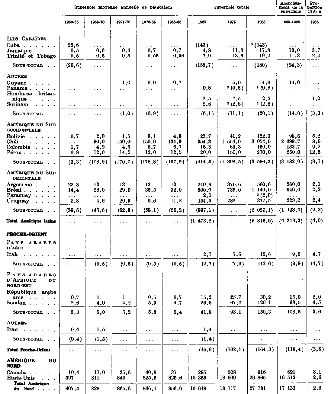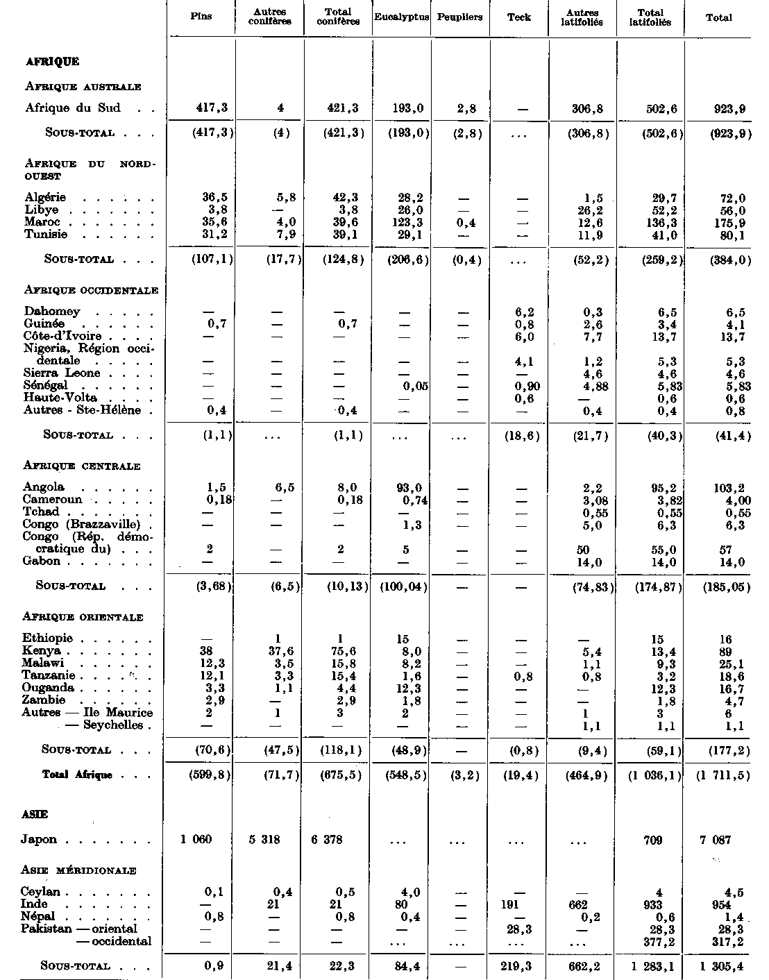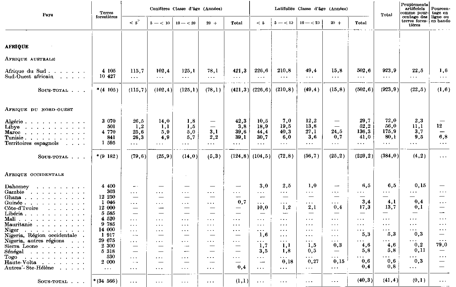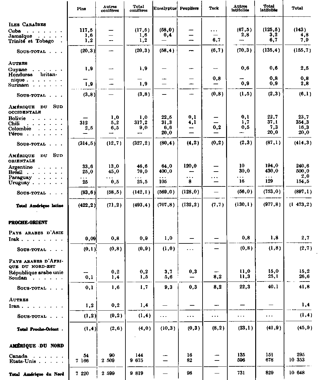 ABREVIATIONS ET SIGNES: Ha Hectare; - Néant ou insignifiant; ... Non disponible; () Chiffre connu pour être incomplet; En particulier totaux et sous-totaux couvrant les régions dont les pays n'ont pas fourni de données. * Total partiel réduit ou superficie totale réduite de la terre forestière, égal au terrain forestier total de ceux des pays ayant fourni des rapports sur les forêts artificielles. - ¹ Chiffre non officiel. - ² Chiffre anormalement élevé, du à une grande proportion d'arbres de bordureou d'alignement à l'exterieur des forêts. - ³ Pas de prévisions disponibles. Un chiffre minimal, égal à la surface des peuplements forestiers artificiels 10 (ou 20) ans auparavant, a été inséré. SIECA: Secretaría permanente del Tratado general de integración económica centroamericana (Traité général d'intégration économique de l'Amérique centrale).Pays dont les données sont négligeables ou inexistantes:Féd. de l'Arabie du Sud, Koweit, Malte. - Les chiffres de la colonne «Terres forestières» sont extraits de l'Inventaire forestier mondial 1963