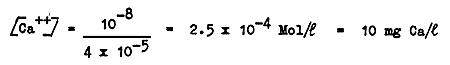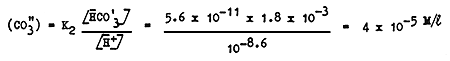 In a solution containing 1.8 milliequiv. HCO3 - ions with a pH of 8.6, which solution is in equilibrium with the CO2 in the air at 20°C [Maciolek (1954) gives the pH range for fish ponds as 6.5 – 9, with an optimum around 8] the concentration of the CO"3 is