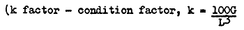 In the Gorleben experiment the increase of the k factor was found to be higher than normally expected, for at the beginning the eels were extremely lean. Table IV demonstrates to what extent the k factor can rise in such a case. In the table the data on two control samples collected on 12 August 1964, three months after stocking, and on 2 July 1965, 14 months after stocking, are compared.