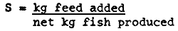 | S | = | pond conversion value for cumulative amount of feed added and for the species of fish stocked. |