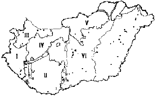 FIGURE 2. - Emplacement des peupleraies expérimentales en Hongrie. Les essais comparatifs à long terme des variétés, avec recherche détaillée sur les exigences de la station, couvrent au total 300 hectares.