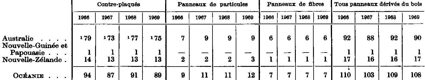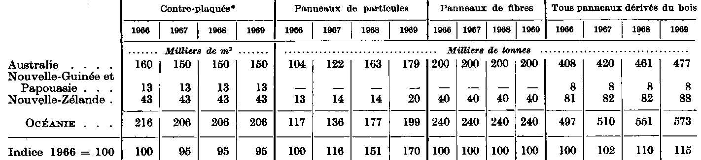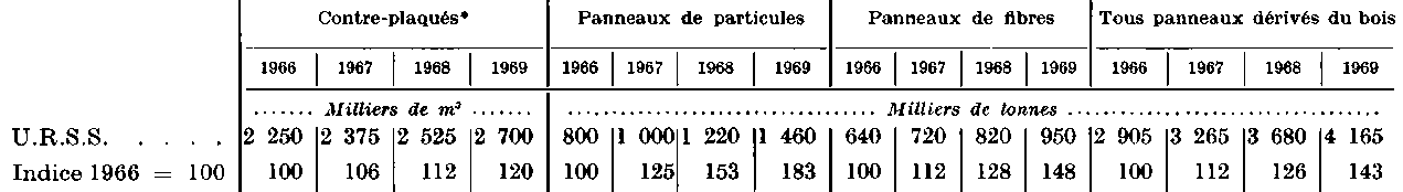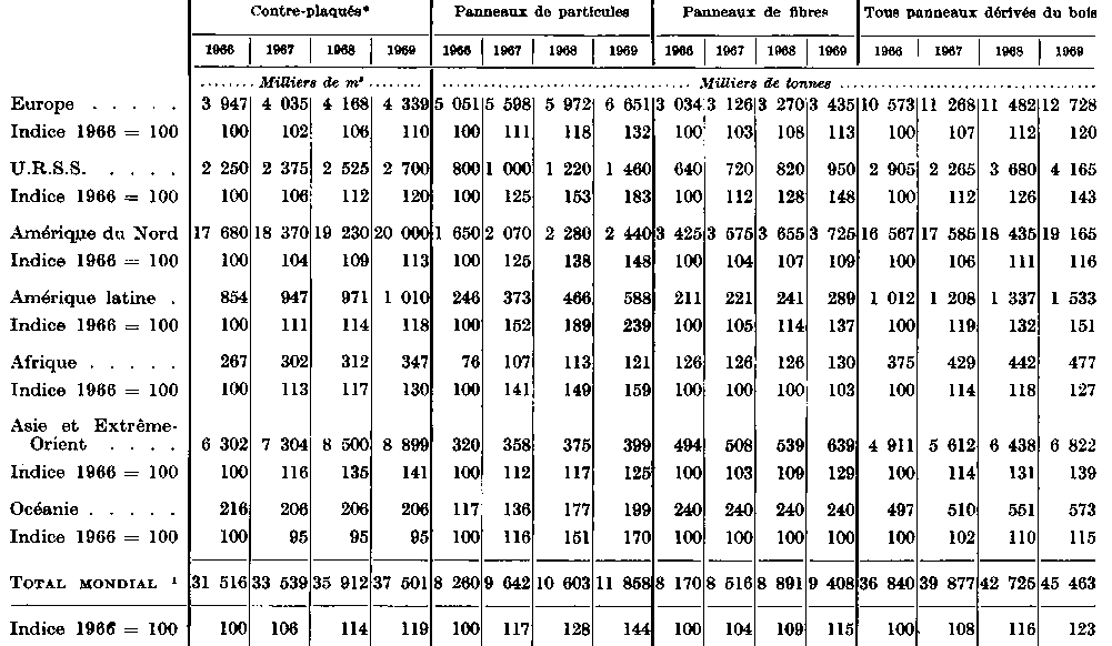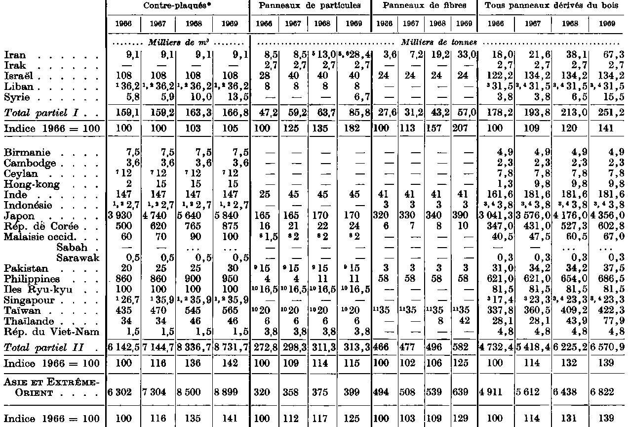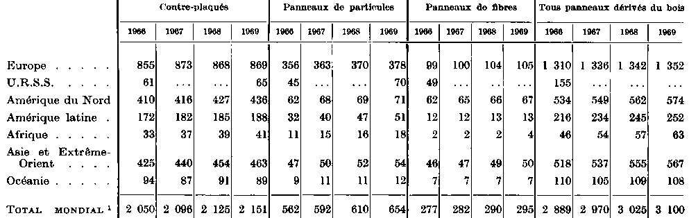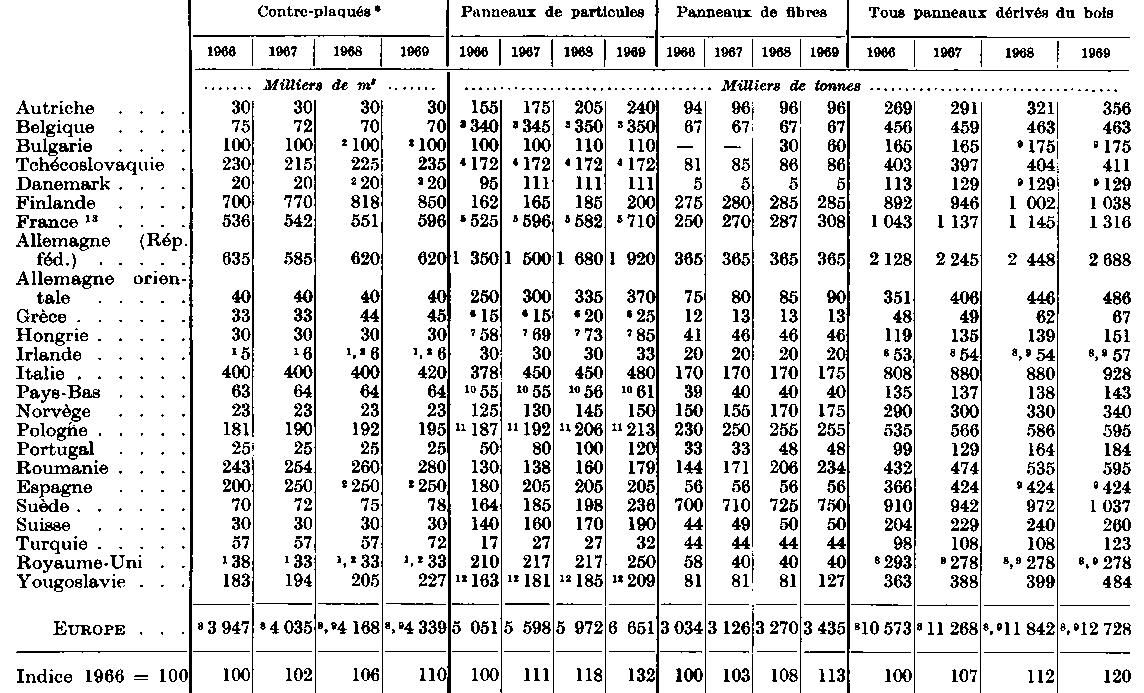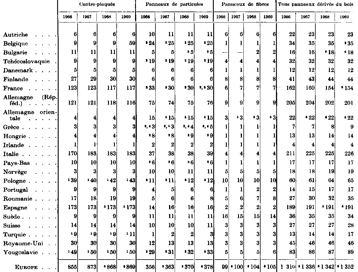 * Coefficient de conversion utilisé pour le contre-plaqué: 1 m3 = 650 kg. - 1 Production. La capacité n'est pas connue. - 2 Les chiffres pour 1968 et 1969 n'étant pas connus, on a repris le chiffre de 1967 pour l'inclure dans le total. - 3 Dont une capacité de production de 260 000 tonnes de panneaux de lin en 1966, de 250 000 tonnes en 1967, 240 000 tonnes en 1968 et de 230 000 tonnes en 1969. - 4 Dont une capacité de panneaux de lin de 41 400 tonnes en 1969. - 5 Dont une capacité de production de panneaux de lin de 85 000 tonnes en 1966, 76 000 tonnes en 1968, 72 000 tonnes en 1968, 70 000 tonnes en 1969. - 6 Dont une capacité de production de panneaux de chanvre de 10 000 tonnes en 1966-67 et de 5 000 tonnes en 1968-69. Dans une fabrique, les panneaux sont fabriqués à partir de tiges de maïs. - 7 Dont une capacité de panneaux de lin de 37 700 tonnes en 1966 et de 41 000 tonnes en 1967-69. - 8 Ce total comprend dans certains cas les chiffres de production et non pas de capacité. - 9 Ce total comprend dans certains cas les chiffres relatifs à la dernière année pour laquelle on avait des données et non pas aux années indiquées. - 10 Dont une capacité de production de panneaux de lin de 15 000 tonnes en 1966-69. - 11 La production annuelle de panneaux de lin représentait plus de 74 000 tonnes. - 12 Dont une capacité de production de panneaux de lin de 29 000 tonnes en 1969, 39 000 tonnes en 1967-68, 40 000 tonnes en 1969. - 13 Coefficient de conversion utilisé pour le contre-plaqué: 1 m3 = 500 kg.