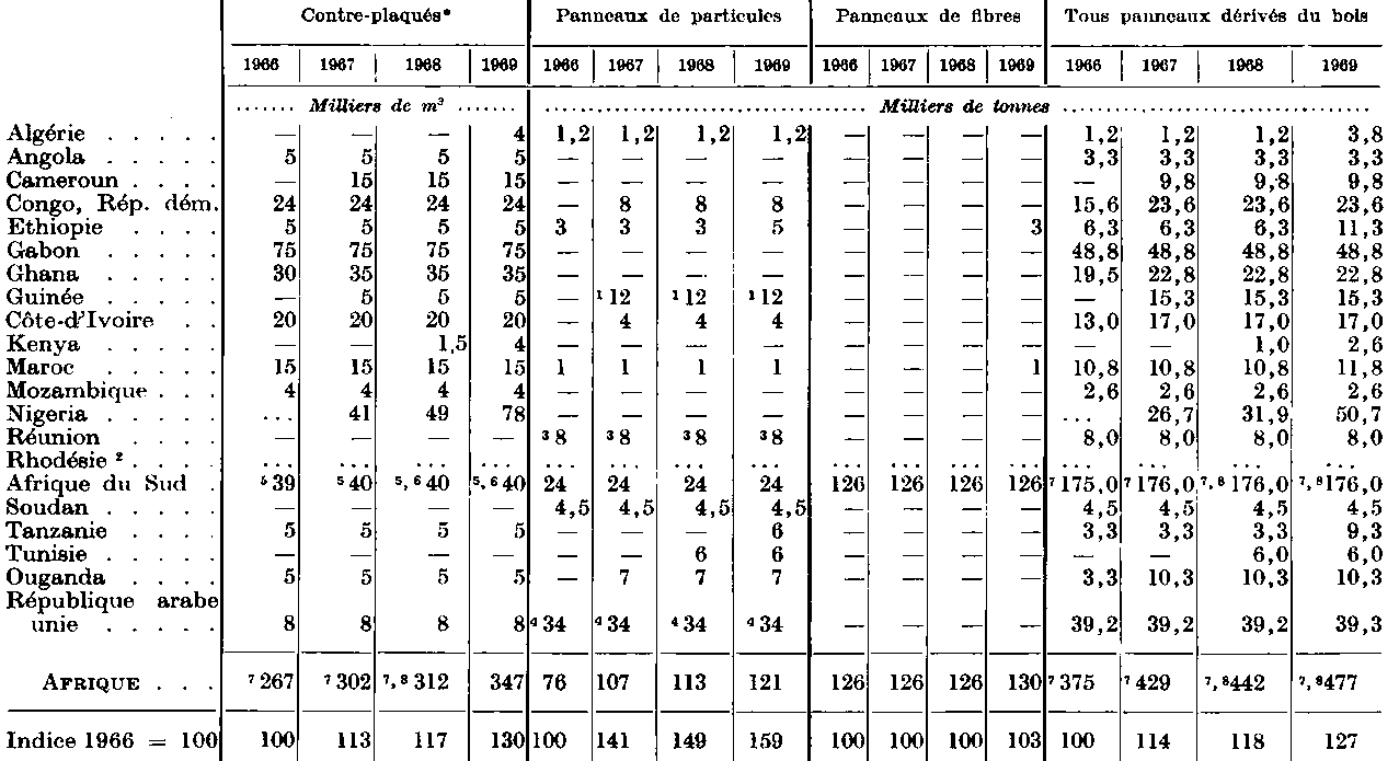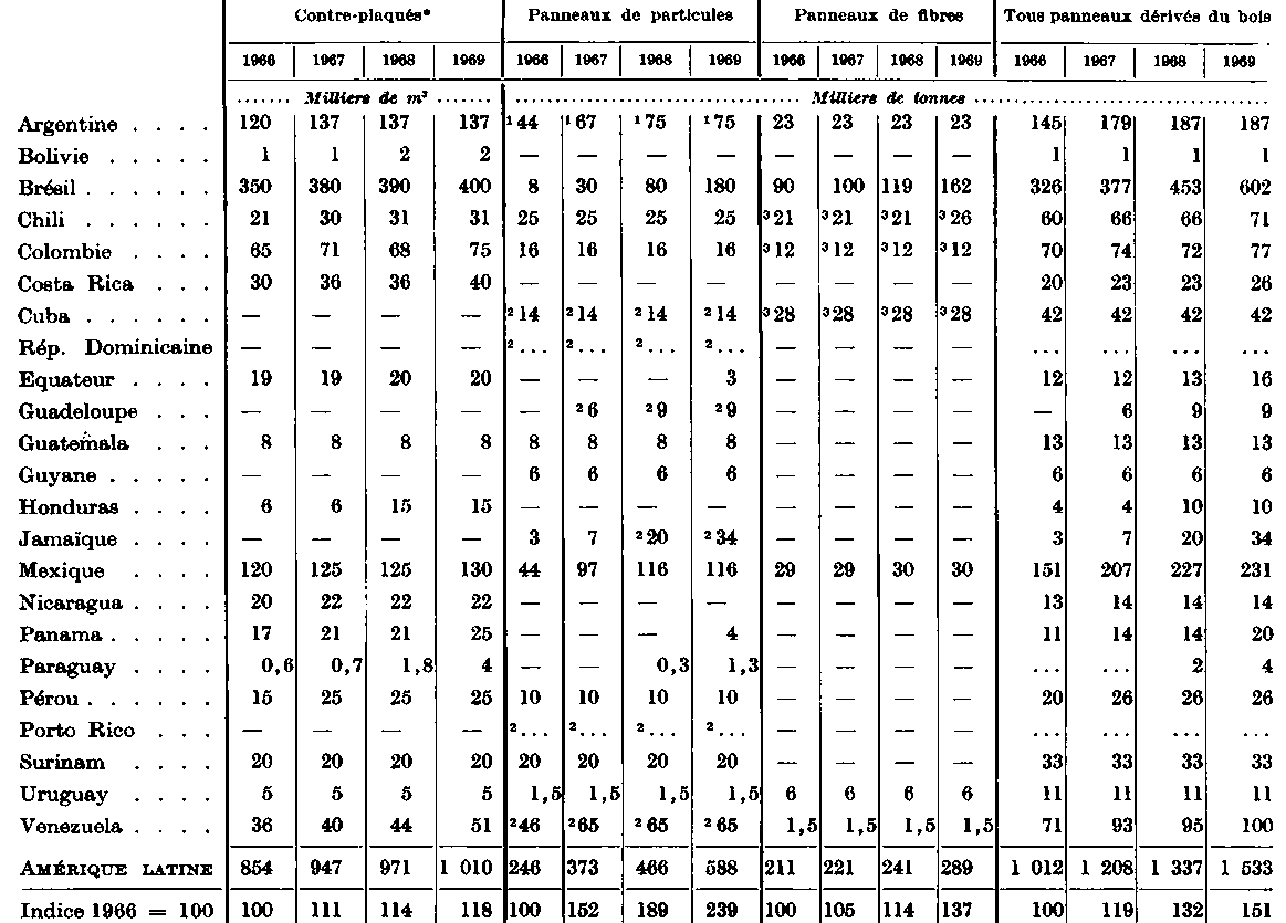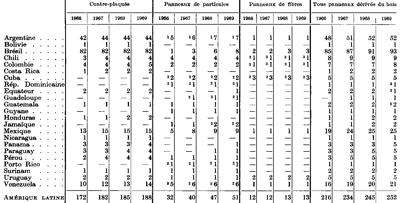* Coefficient de conversion utilisé pour le contre-plaqué: 1 m3 = 650 kg. - 1 Production basée sur les tiges de quinquina. - 2 Pas de renseignements disponibles. - 3 Sur la base de six mois de fonctionnement pendant la saison de traitement de la canne à sucre. - 4 Une fabrique basée sur la bagasse a une capacité annuelle de 20 000 tonnes, une fabrique basée sur le débris de lin (capacité de 30 tonnes/jour) signale une production de 877 m3 en 1965. - 5 Production. La capacité est inconnue. - 6 La chiffre pour 1968 et 1969 n'étant pas connu, on a repris celui de 1967 pour obtenir un total. - 7 Ce total comprend dans certains cas le chiffre relatif à la production et non pas à la capacité. - 8 Ce total comprend dans certains cas les chiffres relatifs à la dernière année pour laquelle on a des données et non pas aux années indiquées.