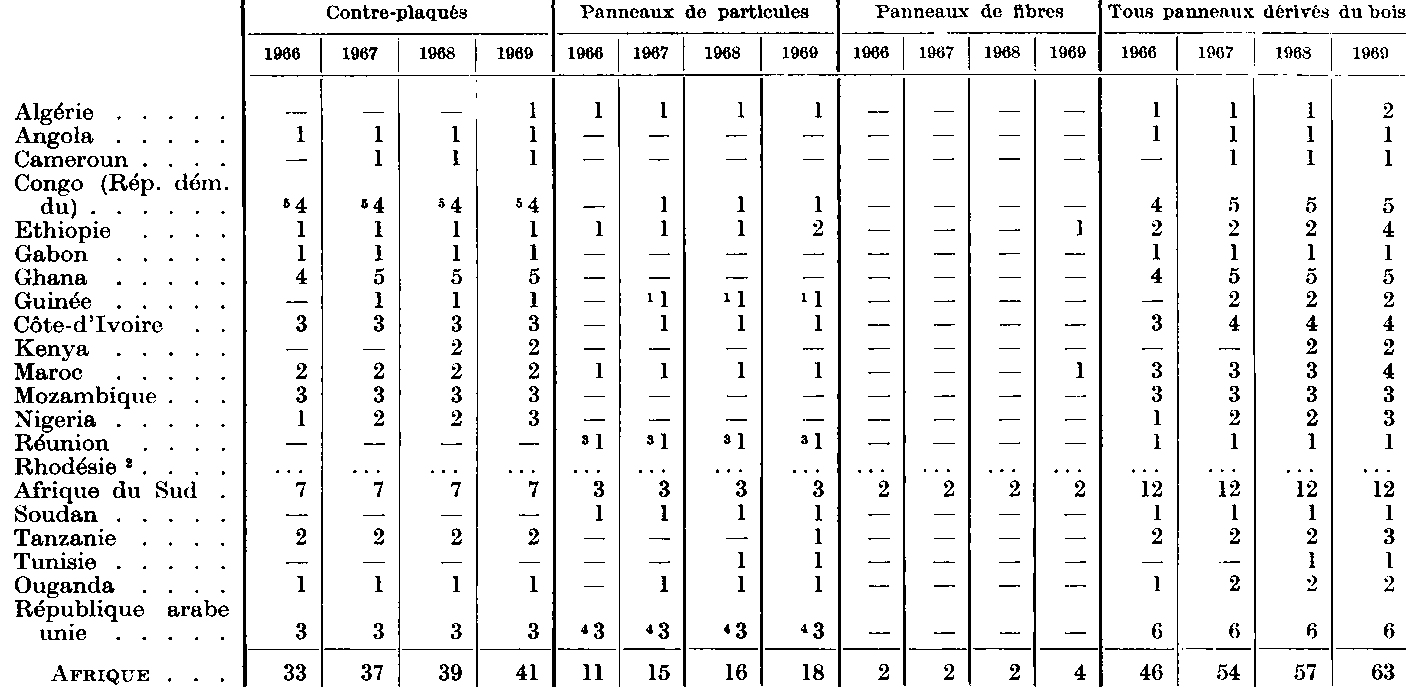 1 Chine continentale non comprise.TABLEAU A2. - MONDE1: PANNEAUX DÉRIVÉS DU BOIS: NOMBRE DE FABRIQUES ESTIMÉ, 1966-69