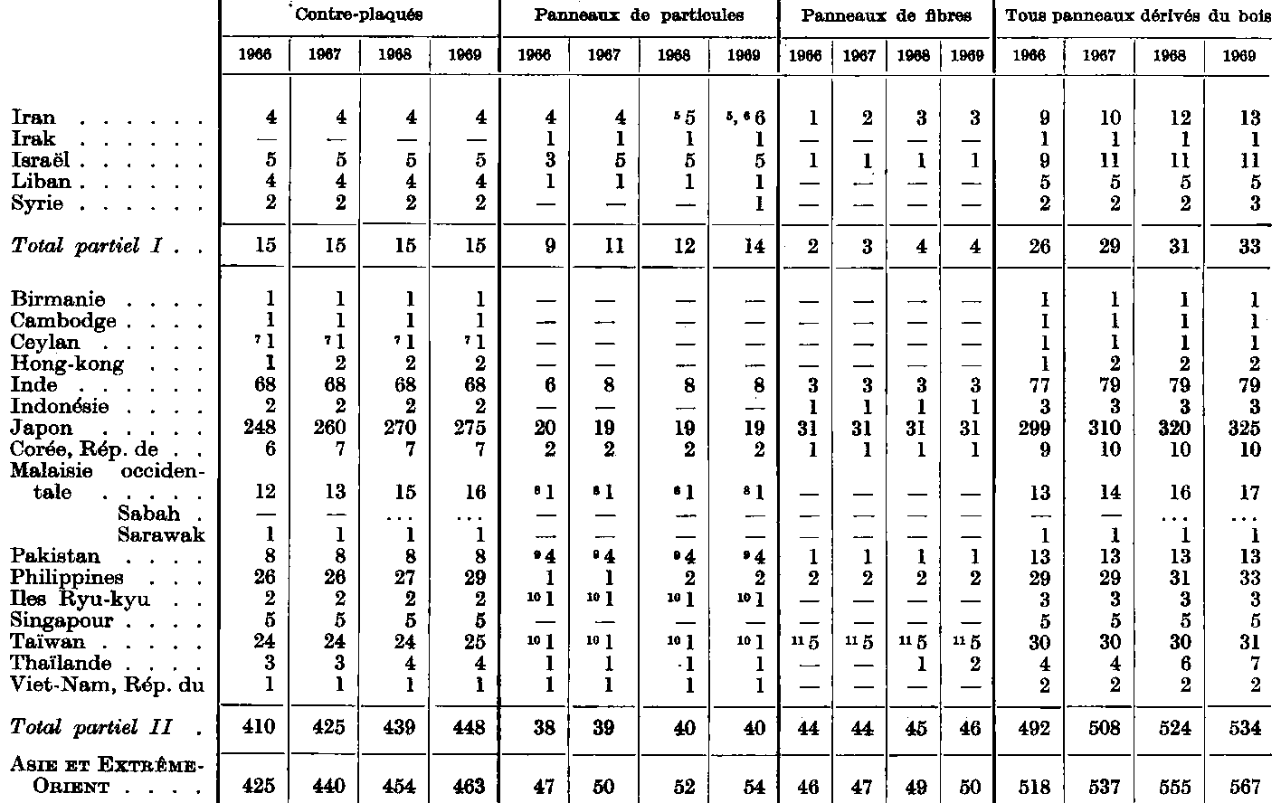 1 Fabriques de placages et de contre-plaqués. - 2 Une partie de la production est basée sur le lin. - 3 Une partie de la production est basée sur le chanvre. - 4 Une partie de la production est basée sur les tiges de mais. - 5 Données non disponibles. On a utilisé le chiffre des années précédentes pour obtenir un total. - 6 Ce total comprend certains chiffres relatifs aux années précédentes.