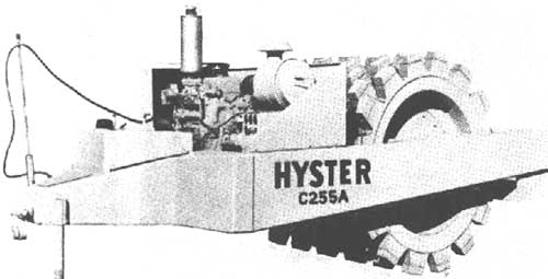 Vibrocompactadora de suelos C255A. - Proyectada para su utilización en una gran variedad de suelos, tiene 80 pulgadas (200 cm) de anchura, con un diámetro externo del tambor de 60 pulgadas (150 cm). Desarrolla una fuerza compactadora dinámica de 49000 lb (22000 kg). El control a distancia de los mecanismos de arranque, parada, aceleración y embrague permite maniobrar la máquina totalmente desde el remolque.