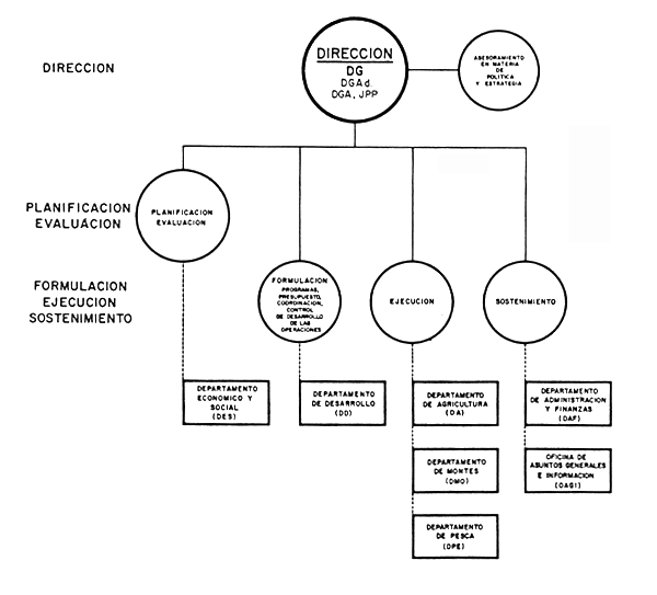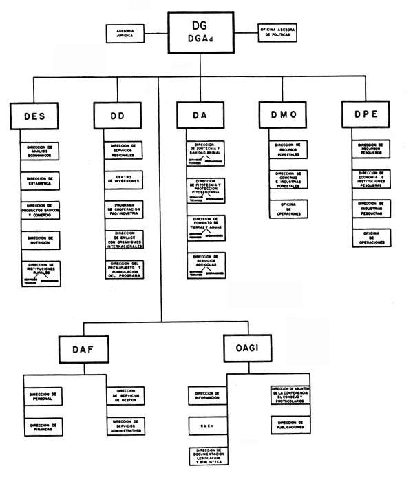 25. La estructura de departamentos y direcciones necesaria para dar una orientación apropiada a la planificación y ejecución de las actividades de la FAO (véase más adelante organigrama II) debe comprender los sectores siguientes: