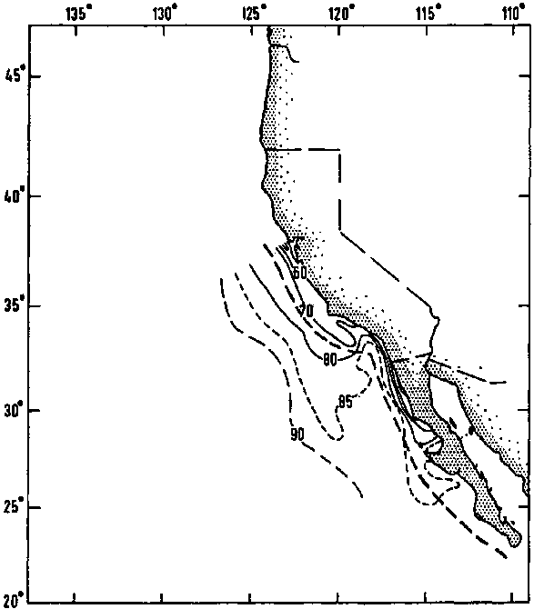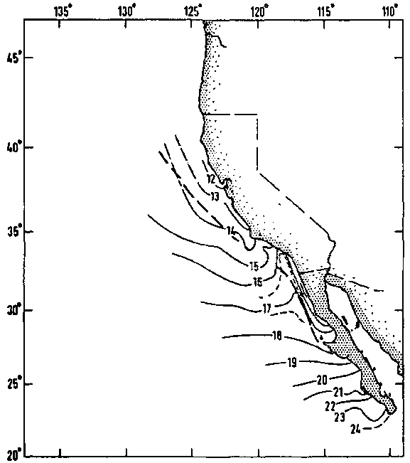 The thirteen-year mean temperatures at 10 m off California and Baja California, from 1950 to 1962, are shown in Figure 4, (Lynn, 1967). Because of the intense sampling in the area as part of the Calcofi programme, the distributions are well established. The physical boundary to the coastal upwelling has been drawn by eye where the isotherms tend to run parallel to the coast. From Baja California to Point Conception, the boundary is about 100 km offshore, but from Point Conception to Cape Mendocino it may be nearer 200 km. Lynn has examined the same data in much more detail. All the temperature data were fitted to a harmonic regression by date. The high correlation of temperature with date shows the stable areas, whereas upwelling is shown by low correlation coefficients.