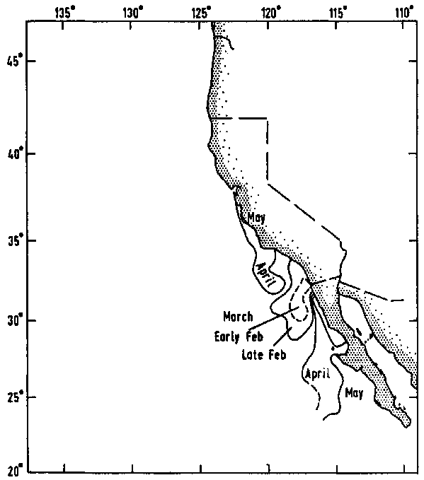 Figure 6. Months of occurrence of the minima of the harmonic regression of temperature on date off California (Lynn, 1967)