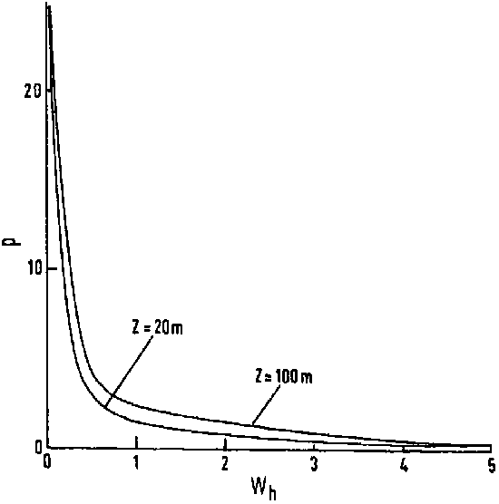 Figure 8. Relation between total production, p, during ascent and ascending velocity, Wh, (in m) for a range of depths of the photic layer.