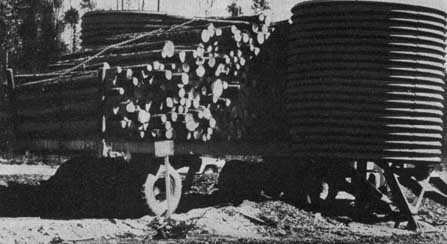 Go-Tract G.T. 220. - The GT 220 is built to go over rock, swamp and stumpland. Engine 183 hp. speed 15 mph (25 kph), length 227 in (576 cm), width 96 in (244 cm) ground clearance 17 in (43 cm) turning radius 23 ft (7 m), drawbar pull up to 40 000 lb (18 000 kg) weight approx. 18500 lb (8400 kg). Illustration shows a GT 200 equipped with a John Deere loader transporting 8 ft (2.4 m) pulpwood.