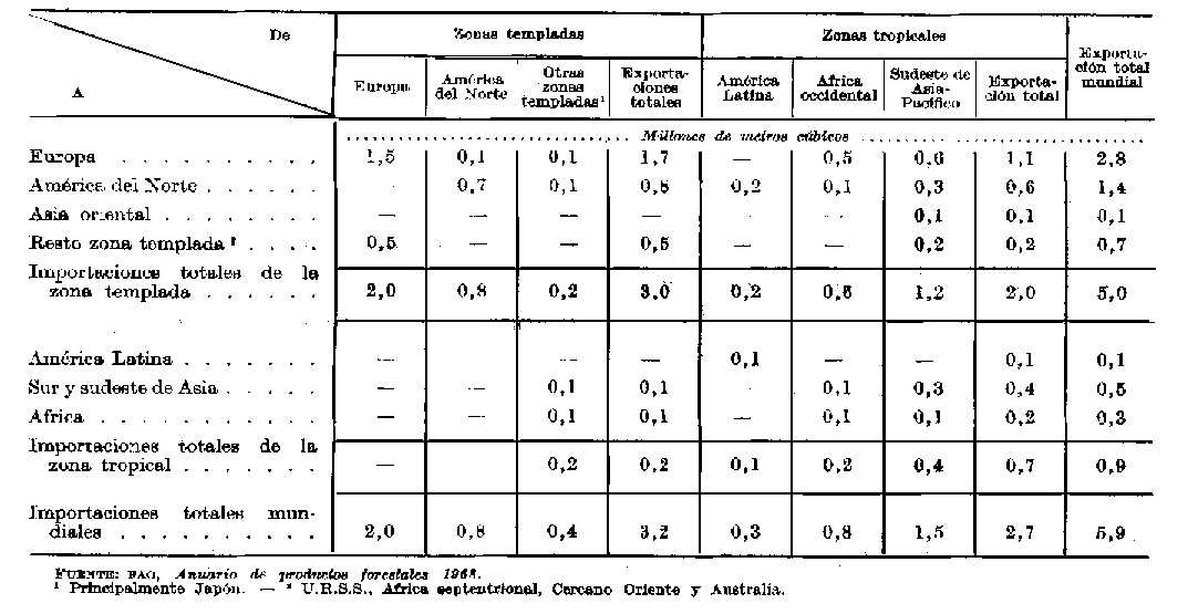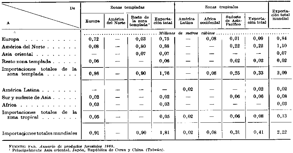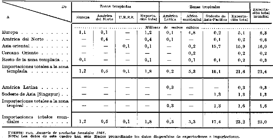 Como puede verse en el Cuadro 12, las exportaciones de madera aserrada de frondosas se duplicaron con creces en el periodo 1953-67, procediendo los dos tercios de este aumento de Europa y de los países tropicales de Asia. Africa, América del Norte y el este de Asia contribuyeron, prácticamente, con la tercera parte restante. Entre todas las exportaciones de madera aserrada de frondosas, la proporción de las originarias de los países tropicales aumentó de un 40 a un 45 por ciento. En el Cuadro 13 se indican las direcciones de las corrientes comerciales en 1967. Este cuadro indica que, de los 5,9 millones de m³, exportados, 3 millones fueron comercializados entre los, países templados, principalmente dentro de Europa y de América del Norte, y otros 0,7 millones de m³, dentro de las regiones tropicales. Muy escasas cantidades pasaron de la zona templada a los países tropicales, mientras que fueron exportadas cantidades considerables de Africa occidental y del sudeste de Asia a Europa y cantidades menores del conjunto de las regiones tropicales a América del Norte. La circulación total de los trópicos a las zonas templadas fue de 1,8 millones de m³.