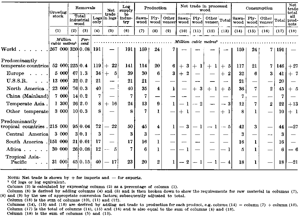 The total net movement of broadleaved wood from the tropical regions largely to supplement or complement the relatively greater harvest from the temperate forests is most significant. In both log and processed form this amounts to 27 million cubic metres which is equivalent to 15 percent of world broadleaved removals and 40 percent of the tropical harvest. This results in the consumption of the temperate regions being four fifths of the world total.