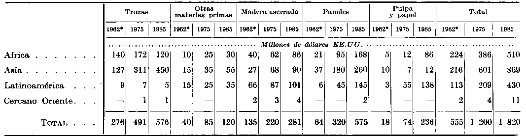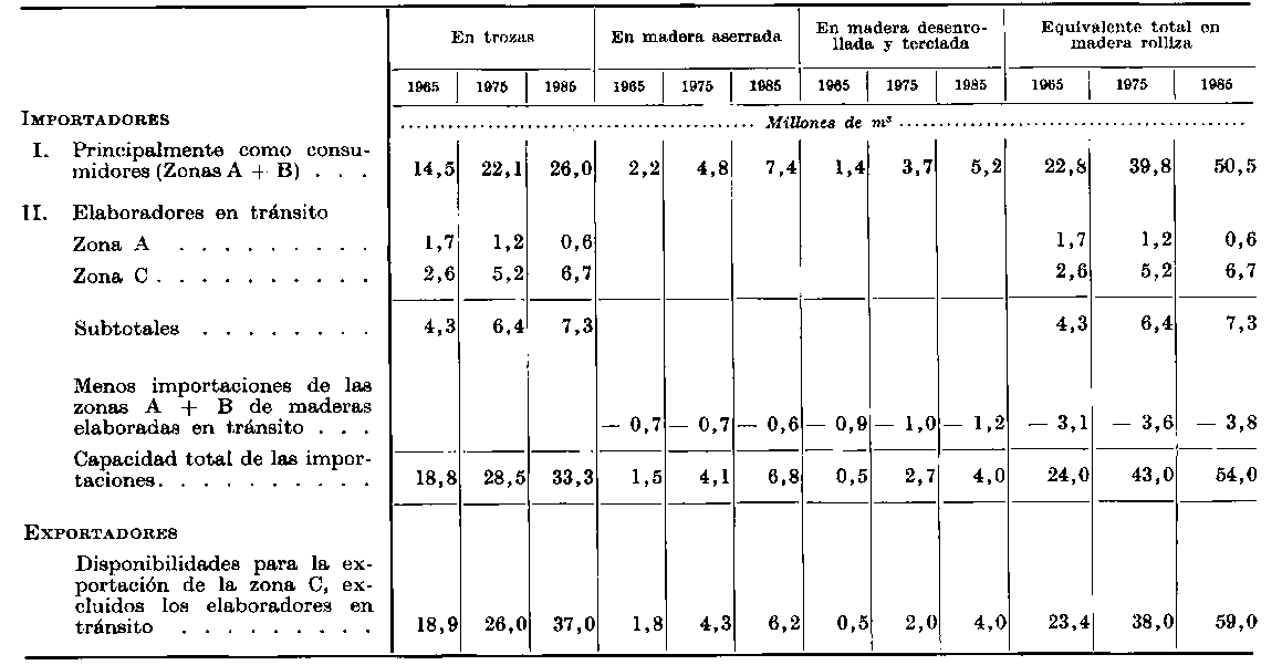 Hacia 1985 se espera que los países importadores de las Zonas A y B absorban 28 millones de m³ más (equivalentes a madera rolliza) de madera tropical, de la que consumieron en 1965. Sin embargo, de este aumento sólo entrarán en ellos en forma de trozas 11,5 millones de m³ el resto del aumento será en forma de madera aserrada (hasta 5,2 millones de m³ y madera desenrollada y terciada (hasta 3,8 millones de m³ Esta parte del aumento correspondiente a madera elaborada procederá, tanto de las nuevas instalaciones montadas en los países de la Zona a ricos en madera, como de la ulterior expansión de las instalaciones para la elaboración de la madera en tránsito que ya existen en la Zona C. Por lo tanto, aunque los objetivos de producción establecidos en este estudio presuponen una expansión muy considerable de las instalaciones elaboradoras dentro de la Zona C, también se presupone que, simultáneamente, se produzca una expansión apreciable de las instalaciones elaboradoras para trozas importadas en las Zonas A y B. Obsérvese que se ha partido del supuesto de que de este aumento del comercio durante el período de 1965 a 1985, unas dos quintas partes serán elaboradas en los países de destino de las Zonas A y B, mientras que las otras tres quintas partes serán elaboradas en las nuevas instalaciones que se monten dentro de la Zona C.