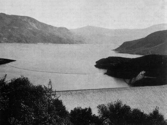 La impresionante presa de Kremasta en el río Aqueloos de Grecia occidental, que se dice es la mayor presa de terraplén de Europa. La central de Kremasta es el mayor conjunto hidroeléctrico en funcionamiento de Grecia, con una capacidad instalada de 437 000 kilovatios. El embalse forma uno de los mayores Lagos artificiales de Europa y cubre más de 8 000 ha con un contenido de 4 700 millones de m³ de agua. Esta creación tiene una gran importancia para el proyecto PNUD/FAO, actualmente en vías de ejecución, en el cual se está estudiando la posibilidad de crear un complejo de industrias forestales en esta zona.