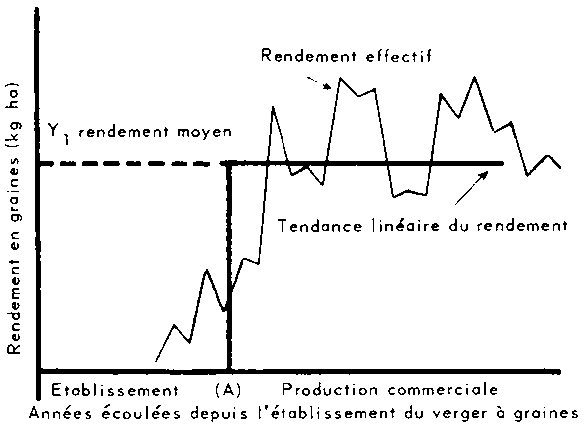Pour calculer le prix de revient des graines produites en verger, il faut simplifier le problème et travailler sur des hypothèses. Normalement, on distingue dans la durée de révolution du verger (figure 26) une période d'établissement et une période de production commerciale. Comme il y a toujours une certaine périodicité des récoltes de graines, on calcule le rendement moyen pour toute la période de rendement commercial.