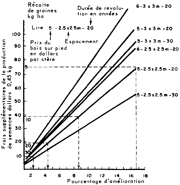 FIGURE 29. - Amélioration en pourcentage requise pour justifier les frais supplémentaires en fonction de différents programmes de plantation, compte tenu du, prix du bois sur pied et de la rotation, lorsqu'on utilise des semences améliorées caractérisées par des coûts de production différents.