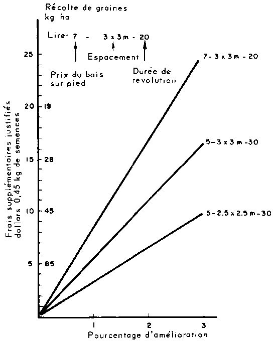 En outre, les graines provenant de vergers bénéficient évidemment d'une amélioration physiologique, ce qui a beaucoup d'importance dans les pépinières et, par la suite, dans les travaux de reboisement. L'amélioration des semences et des plants donne de meilleures chances aux nouveaux peuplements comportant moins d'arbres à l'hectare. L'exploitation mécanisée de demain imposera un diamètre aussi uniforme que possible des fûts. Il y a tout lieu de penser qu'à cet égard aussi, le matériel amélioré sera important parce qu'il est plus uniforme. Giordano (1969) signale aussi un autre objectif important pour les sélectionneurs, à savoir la réduction du coût des travaux culturaux par la sélection du matériel à planter.