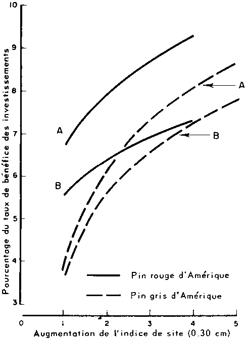 FIGURE 31. - Taux de bénéfice des investissements résultant de différents programmes d'amélioration du pin rouge et du pin gris d'Amérique correspondant à des augmentations données de l'indice de site, les arbres améliorés étant plantés dans des terres d'indice 55. (LUNDGREN ET KING, (1966))