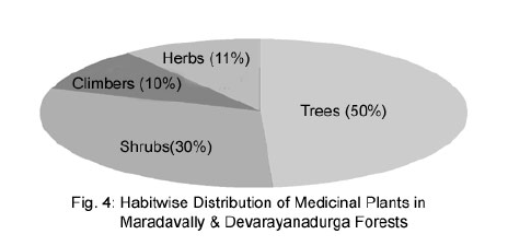 - Analysis of habitwise distributions of medicinal plants in Maradavally and Devarayanadurga forests indicates that the trees constitute nearly 50% of the plant population. Herbs form 11%, shrubs form 30% and climbers form 10% of the population.
