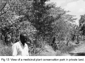 Cultivation of many medicinal plants on private land is required both to conserve the species and to ensure the supply of quality raw material to the industry. Conservation of medicinal plant species in private land by resource rich individuals has been successful. For example there is Dr. Hanume Gowda, an Ayurvedic Herbal practitioner in Tumkur District who has developed 'Sanjeevani Vana', a two hectare medicinal plant conservation park in the foot hills of degraded Suvarnagiri, 20 km from Devarayanadurga Forest. Since 1999, 3000 plants belonging to about 550 varieties of herbs, shrubs and trees collected from different agro-climatic regions of the country have been introduced in this garden. Many of these species are rare and endangered. The entire park is raised and maintained using the organic agriculture system and without using any fertilizers or pesticides. Today this park serves not only as the source for raw materials for his hospital but also as the study centre for thousands of students, scientists and herbalists of this region. He is a resource rich individual with adequate knowledge of plants and their uses. This concept may well be replicated for conservation of medicinal plant biodiversity on private land.