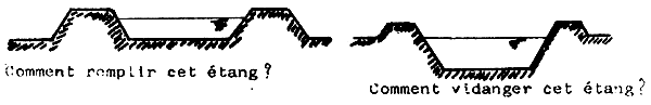 Pour en tirer le maximum de profit il faut que l'étang puisse être en production pendant toute l'année. Il faut done une alimentation en eau pendant toute l'année. Il faut de l'eau pour remplir les étangs et pour maintenir l'eau à niveau. On doit compenser les pertes d'eau par évaporation et par infiltration. C'est pendant la saison sèche quand il y a peu d'eau, que les pertes sont grandes. Pour maintenir sous eau une pisciculture d'un hectare, il faut 2 à 5 litres d'eau par seconde. Ce débit d'eau est done à contrôler pendant la saison sèche.