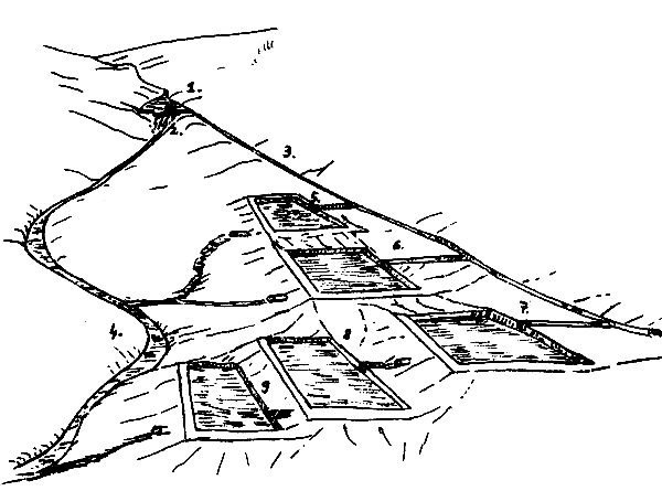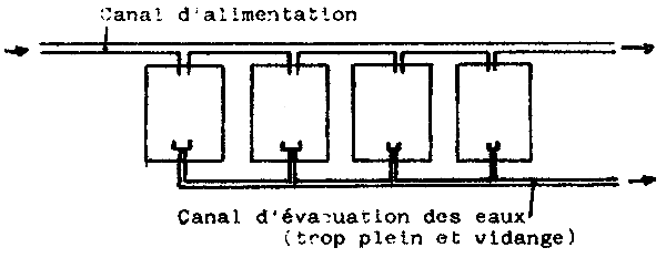 Chaque étang en parallèle a une prise d'eau individuelle sur le canal d'alimentation. Chaque étang peut être rempli et vidangé indépendamment des autres étangs.